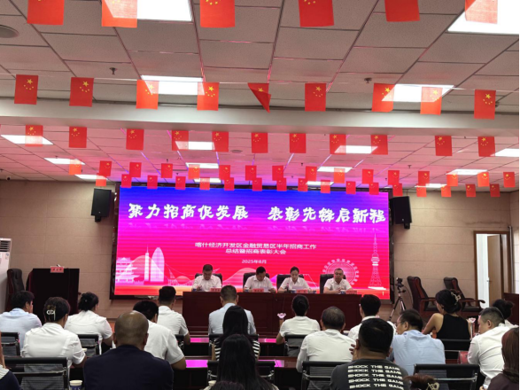 8月28日上午,喀什经济开发区金融贸易区举办2025上半年招商工作总结会暨招商先进集体及个人表彰大会,城东中心全体党员职工及各楼宇大厦负责人、商协会负责人、企业家代表等70余人参加会议。